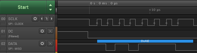 先用分析仪捕获MSP430控制OLED的几根主要信号线(时钟、指令/数据标志、数据等),为了研究问题简单,只捕获初始化程序第一字节指令,时序图如下: