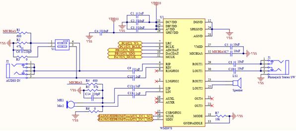 芯片解密ESK32-360开发板在硬件上支持音频的录制和播放,它是以I2S接口的WM8978编解码芯片来实现的,其接口电路如图1所示。