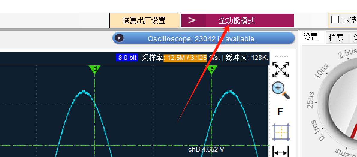 芯片解密LOTO示波器软件现在启动后默认就进入这个极简模式,基本上只能使用最基础的功能,点击软件上的“极简模式”按钮以后,就会切换到“全功能模式”,如下图所示: