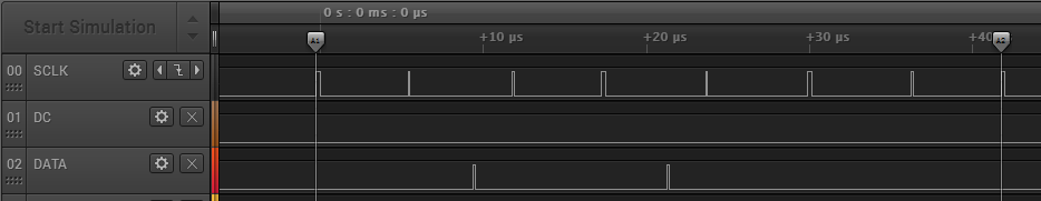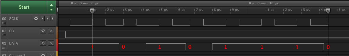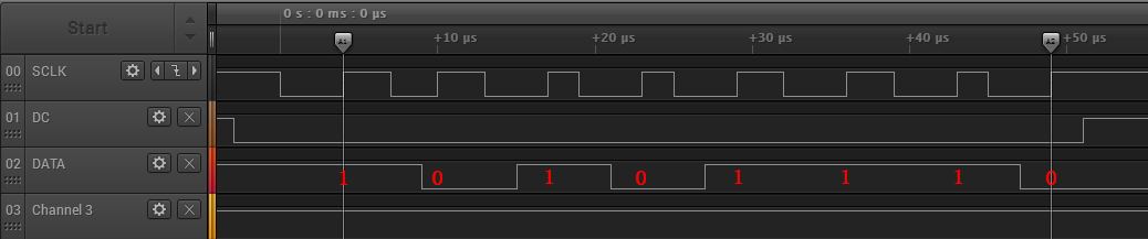 这个时序图一看就不正常,芯片破解感觉时钟脉冲的“占空比”都比较小,形成的脉冲很窄,D/C波形也没看到有高电平,数据也不正确。
