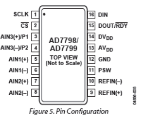 芯片解密AD7798,AD7799引脚图,采用16引脚TSSOP封装。采用2.7V至5.25V电源供电,AD7799的典型功耗为380μA。