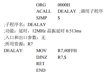解:参考程序如下,其中DEALAY为由例3-69延时程序改写的延时子程序。其中,RET指令的机器周期数为2,因此子程序DEALAY比例3-69程序的延时时间多两个机器周期,即2μs。另外,子程序DEALAY没有入口和出口参数。