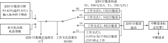 MCS-51单片机的两个定时/计数器T0和T1有定时和计数两种功能,分别由一对特殊功能寄存器组构成,即TH0、TL0和TH1、TL1,其基本工作原理如图4-7所示。